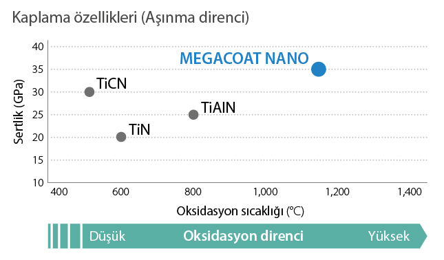 Yüksek sertlik (35GPa) ve üstün oksitlenme direnci (oksitlenme sıcaklığı 1,150°C) ile aşınma ve kırılmayı önler.