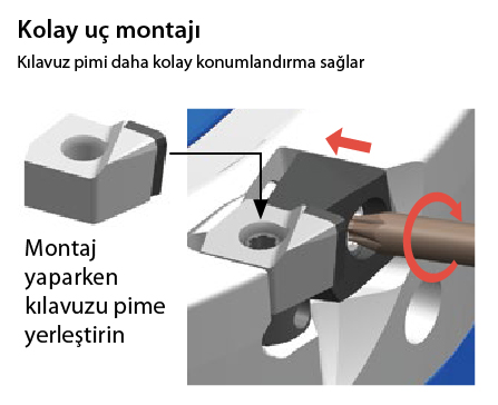 Büyük gerçek talaş açısı ve çift kenarlı uç tasarımları mevcuttur.
