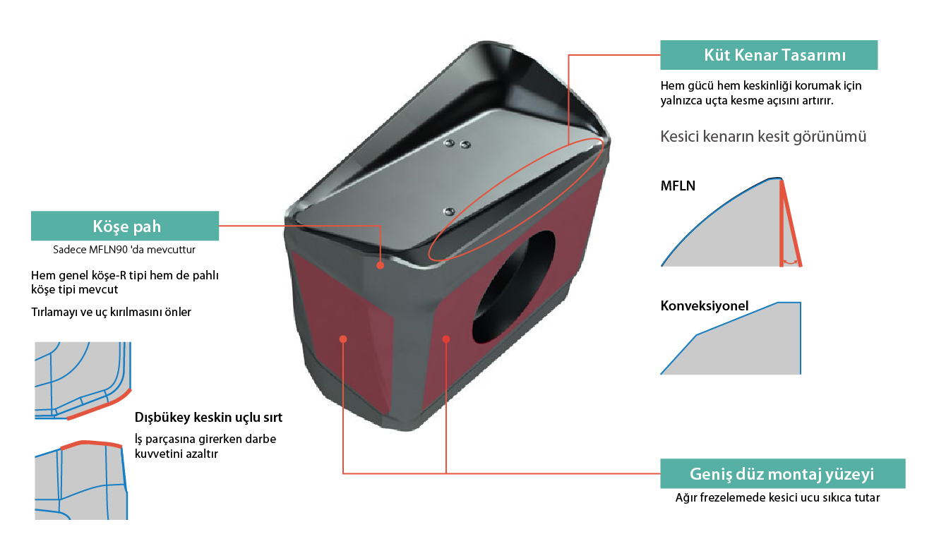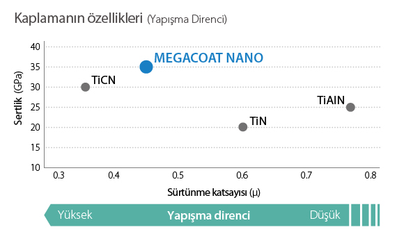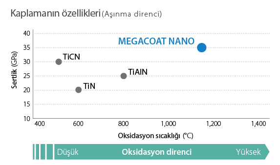 Özel nano kaplama tabakası '' MEGACOAT NANO'' ile kararlı tornalama işlemi ve uzun takım ömrü ,yüksek sertlik (35GPa) ve üstün oksitlenme direnci (oksitlenme sıcaklığı 1,150°C) ile aşınma ve kırılmayı önler.