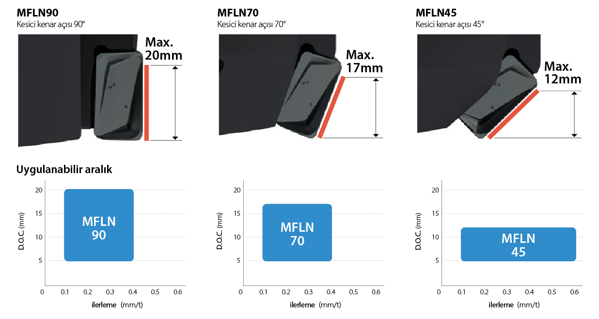 Büyük 90°, 70° ve 45° kesici kenar açılarıyla yüksek ilerleme hızları mevcuttur.