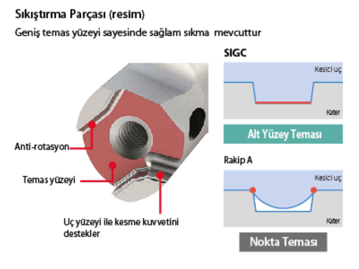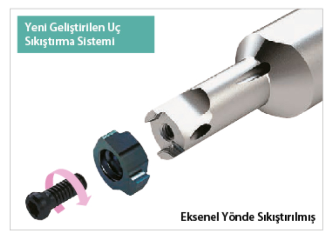 Ek parçanın alt yüzeyini eksenel yönde çekerek yapılan sağlam sıkıştırma eylemi kesici uçta sıkı bir kenetleme sağlanarak, kararlı işleme elde edilir.