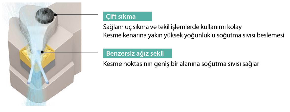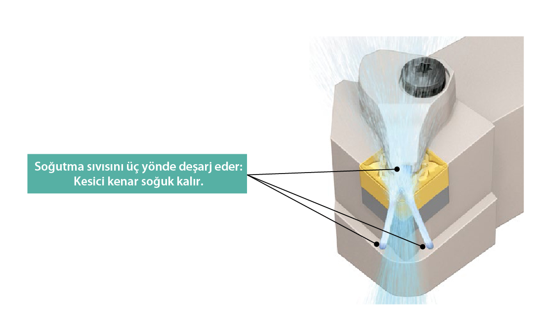 Soğutma sıvısı, eşit soğutma hareketi sağlamak için ek parçanın yan yüzüne doğru iki yönden de yönlendirilir Geliştirilmiş aşınma direnci ile daha uzun takım ömrü ve yüksek hızlı işleme * Soğutucu besleme sistemi türüne bağlıdır