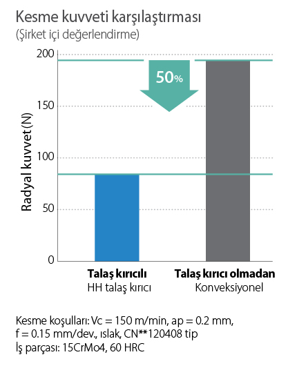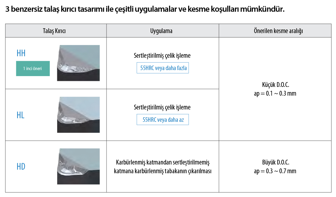 Kalıplanmış talaş kırıcı, kenar hazırlığı ve keskin kesme performansı ile düşük kesme kuvveti ve mükemmel talaş kontrolü  sağlar.